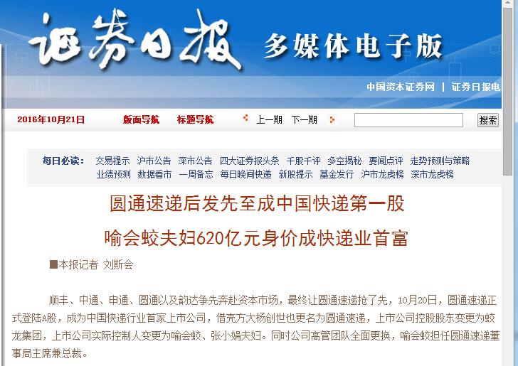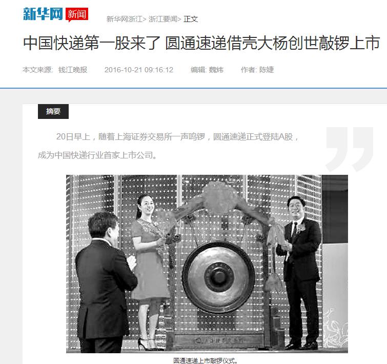 2016年10月20日上午9點30分,隨著在上海證券交易所一聲鳴鑼,圓通速遞股份有限公司正式登陸A股,成為中國快遞行業(yè)首家上市公司。 圓通速遞成功上市的消息引起了各大媒體的熱切關(guān)注。新華網(wǎng)、中華工商時報、新京報、每日經(jīng)濟新聞、第一財經(jīng)、經(jīng)濟觀察報、證券日報、新聞晨報、南方都市報、錢江晚報等近百家媒體對此紛紛進行宣傳報道,轉(zhuǎn)載量達千余次。 以下為部分媒體報道截圖: