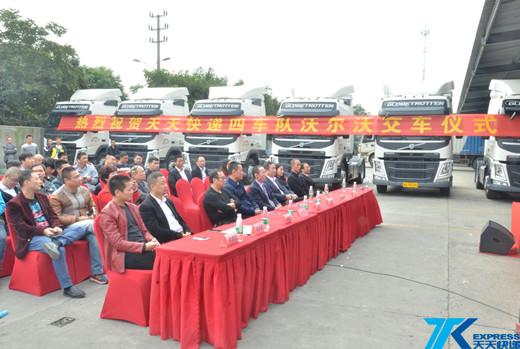 10月30日上午,天天快遞四車隊(duì)沃爾沃交車儀式在天天快遞杭州集散舉行,天天快遞總部運(yùn)管部調(diào)度中心相關(guān)負(fù)責(zé)人、杭州集散中心經(jīng)理鄭建宏,天天快遞四車隊(duì)鑫淼物流總經(jīng)理李德平,沃爾沃中國華東區(qū)總經(jīng)理沈力強(qiáng),寧波甬沃汽車有限公司總經(jīng)理姚程宏,浙江萬盾資產(chǎn)管理有限公司總經(jīng)理助理徐婧,山東駿通專用車有限公司總經(jīng)理張建強(qiáng),浙江宗海物聯(lián)網(wǎng)發(fā)展有限公司總經(jīng)理張文進(jìn),浙江高速交警總隊(duì)徐洋,下沙派出所所長周春華參加本次儀式。